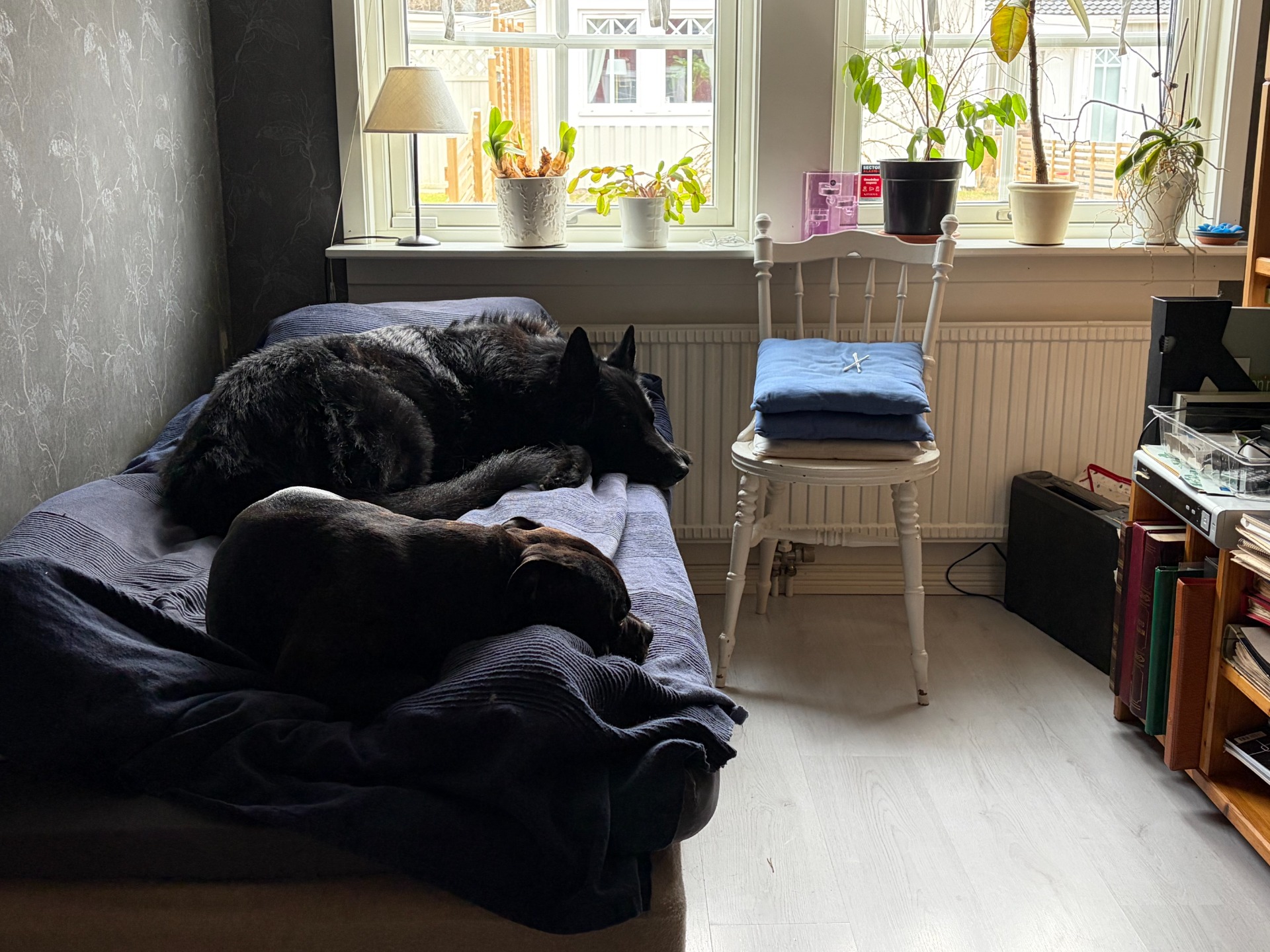 Vaknar av att ha fler än en hund i sängen, kusinerna har kommit, här finns inte en chans att sova vidare.